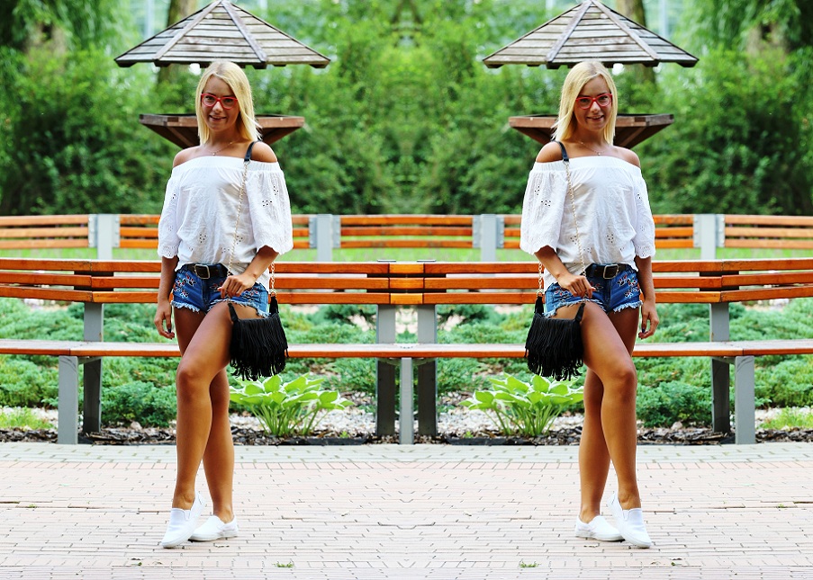 Witajcie! W dzisiejsze, letniej stylizacji chciałabym Wam pokazać połączenie jeansu oraz bieli. Wszystkie ubrania, która zobaczycie na poniższych zdjęciach pochodzą ze sklepu Bonprix.pl. Przeszukując asortyment z powyższego sklepu natknęłam się na modne w tym sezonie jeansowe szorty z naszytymi kwiatami oraz białą bluzkę z haftem (również kwiatowym). Kiedy zdecydowałam, się już na spodenki jak i na bluzkę zaczęłam szukać butów. Bez dłuższego zastanawiania się wybrałam białe trampki i liczyłam na to, że zostaną białe na wieki. Niestety chyba się przeliczyłam, jednak nadzieja umiera ostatnia, więc liczę na to, że jeszcze będą białe….