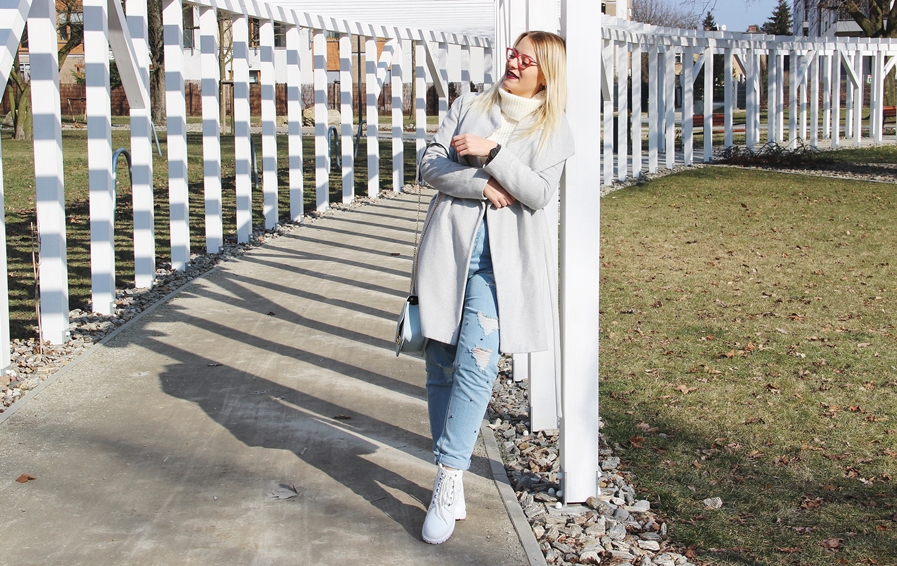 Tak jak obiecałam, tak postępuję, krok po krok, systematycznie! 😇Staram się być tutaj, a nie bywać.💙 W dzisiejszym wpisie przedstawiam Wam debeściaka lat 90’tych – moje ulubione (od niedawna) spodnie MOM JEANS od Bonprix.pl. Spodnie, bez których serial Beverly Hills 90210 nie ujrzałby światła dziennego (żartuje oczywiście😂) i pomyśleć, że jeszcze kilka miesięcy temu zwyczajnie bym ich nie założyła. W mojej szafie wówczas dominowały tylko jeansy 'slim fit’/’skinny fit’, które często określa się jako 'rurki’. Oczywiście większość z wysokim stanem.Jeansy z dzisiejszego wpisu połączyłam z kremowym golfem crop-top. Do stylizacji dobrałam białe trapery, małą błękitną torebkę oraz szary płaszcz. Jak Wam się podoba ? 🙈
